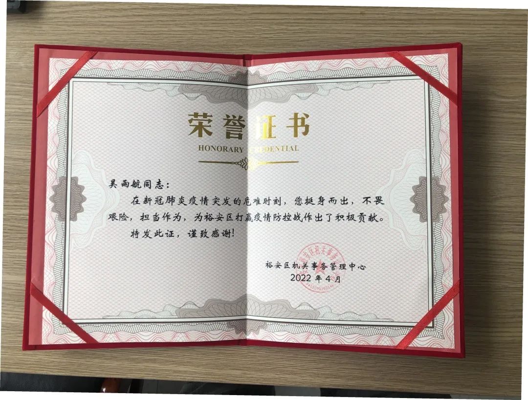 2022年5月1日,六安市金安區、裕安區事務管理服務中心,皖西學院,金安區文化和旅游局對國耀公司在抗疫期間參與的各項工作給予肯定,為我司頒發錦旗,并頒發抗疫人員榮譽證書,高度贊揚國耀公司員工面對風險不退縮、不畏懼,堅守崗位,共克時艱,保障了疫情防控期間工作的順利開展。