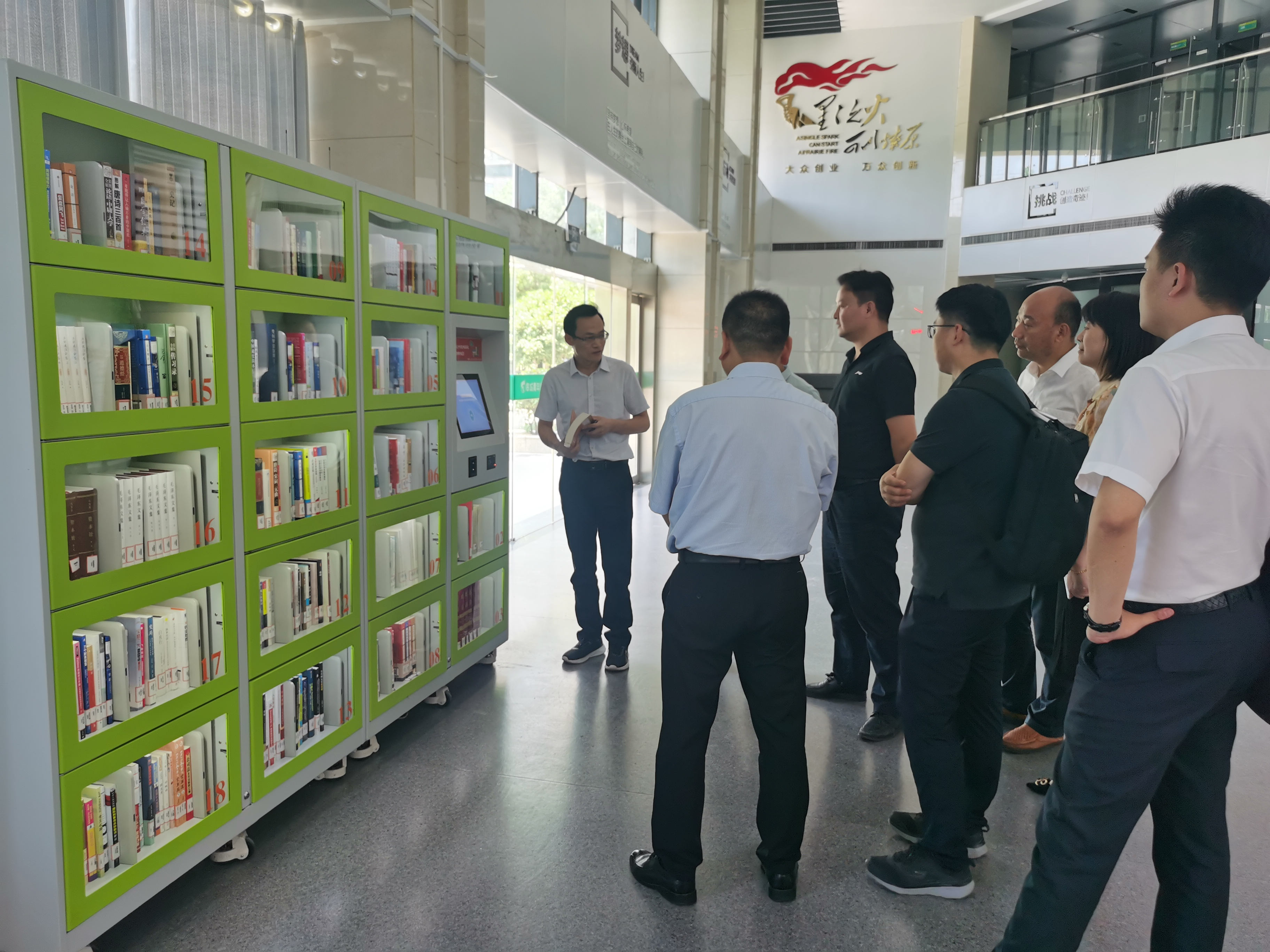 國耀公司總經理陳浩全程陪同并向鄭總一行詳細介紹了國耀公司的發展歷程、經營范圍、戰略規劃等,中通服和信科技有限公司鄭總對國耀公司的企業創新及發展表示高度贊揚,并對國耀公司自主研發的智能圖書柜產品給予充分肯定。