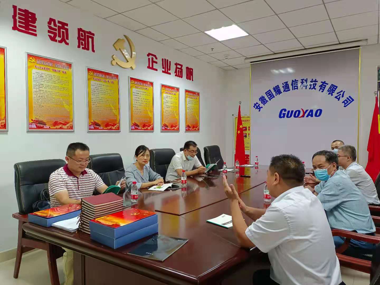2021年8月26日下午,市委黨史學習教育第七巡回指導組副組長、市委督察考核辦公室副主任安珺等一行蒞臨安徽國耀通信科技有限公司調研指導非公企業黨史學習教育工作,市科技局總工程師許有國、市科創中心主任李冬,市科創中心副主任徐治淮等陪同。